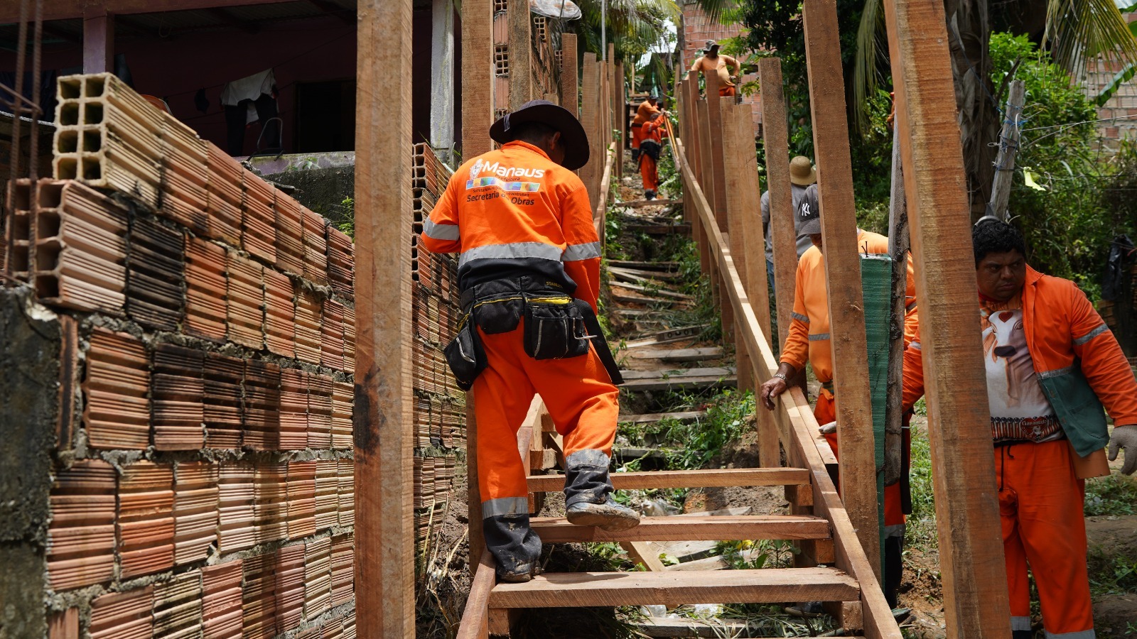 Atendendo à solicitação dos moradores da rua Doutor João de Paula, no bairro Colônia Antônio Aleixo, zona Leste, a Prefeitura de Manaus, por meio da Secretaria Municipal de Infraestrutura (Seminf), realiza, nesta quinta-feira, 10/4, a reconstrução de uma nova escada na área. Uma equipe composta por 20 trabalhadores atua na construção de, aproximadamente, 50 metros de extensão da nova escada. O objetivo é tornar o trajeto mais rápido, firme e muito mais tranquilo.