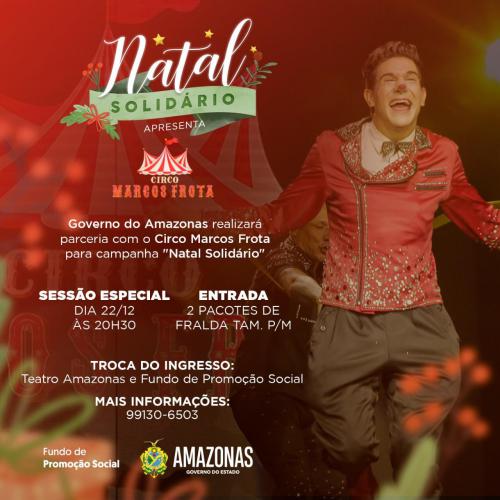 Dando continuidade à Campanha “Natal Solidário”, o Fundo de Promoção Social e Erradicação da Pobreza (FPS), do Governo do Amazonas, realiza uma parceria com o Circo Marcos Frota. Tendo à frente da ação a primeira-dama do Estado, Taiana Lima, a parceria consiste numa sessão especial do Circo e visa promover a arrecadação de fraldas para serem entregues, durante a semana de Natal, nos Kits Enxovais para mães com baixa renda de Manaus que tiverem seus bebês nascidos nas sete maternidades públicas do Estado.