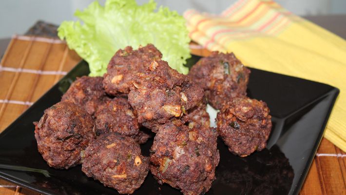 Empane os bolinhos passando pela farinha de trigo, ovos, farinha de trigo novamente, ovos e farinha de rosca.